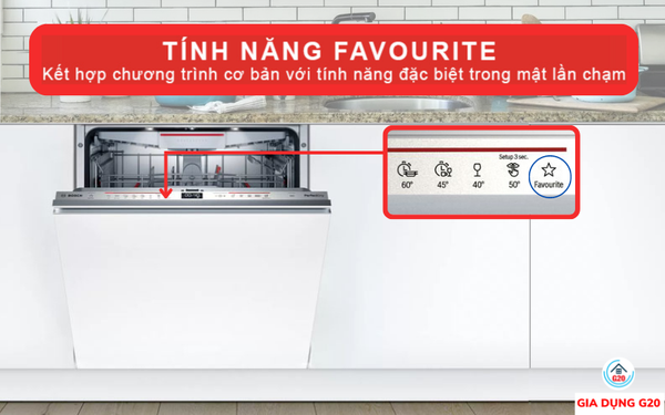 Nếu để ở chế độ mặc định, Favourite sẽ hoạt động như một chương trình rửa tráng. Ngoài ra, Favourite còn có tính năng tích hợp. Chỉ cần chọn 1 chương trình rửa cơ bản và tính năng đặc biệt, sau đó kích hoạt vào Favourite. Máy sẽ lưu vào bộ nhớ và thực hiện đồng thời cả hai tùy chọn đó. Những lần rửa sau chỉ cần nhấn Favourite, máy sẽ thực hiện lại hai chương trình bạn đã tích hợp từ trước.