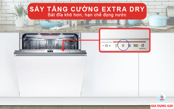Lựa chọn Extra Dry, máy sẽ sử dụng nhiệt độ cao ở lần tráng cuối và tăng thời gian sấy. Vì thế nước trên bề mặt bát đĩa sẽ bay hơi khi nhiệt độ cao. Kết hợp cùng nước làm bóng sẽ giúp bát đĩa bền đẹp hơn sau mỗi lần rửa.