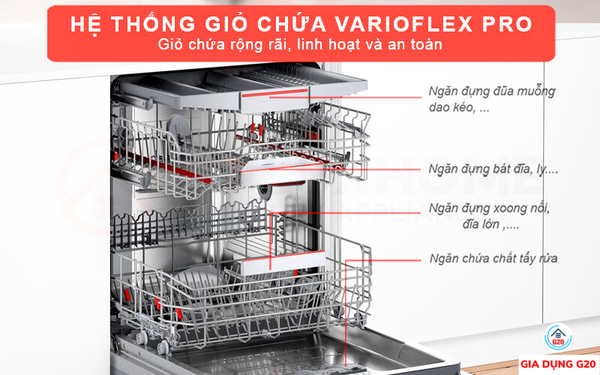 Hệ thống giàn VarioFlex Pro thiết kế 3 tầng rửa riêng biệt. Các đồ dùng nhỏ như bát đĩa, cốc, chén ly vào giàn rửa chính giữa. Còn những vật dụng có kích cỡ lớn như xoong, nồi, chảo, thớt nên xếp vào giỏ dưới cùng.