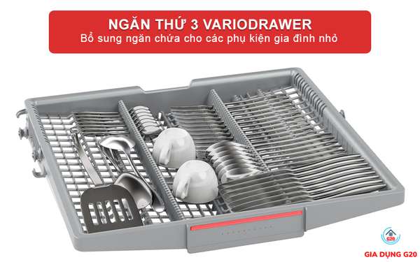 Ngăn chứa thứ 3 Vario Drawer là một giải pháp tăng thêm diện tích chứa đồ. Những vật dụng như dao, kéo, đũa, thìa sẽ được để vào ngăn này. Nhưng cần đảm bảo chúng được xếp riêng rẽ không chồng lên nhau. Cách sắp xếp đồ cũng sẽ giúp máy làm sạch hiệu quả hơn.