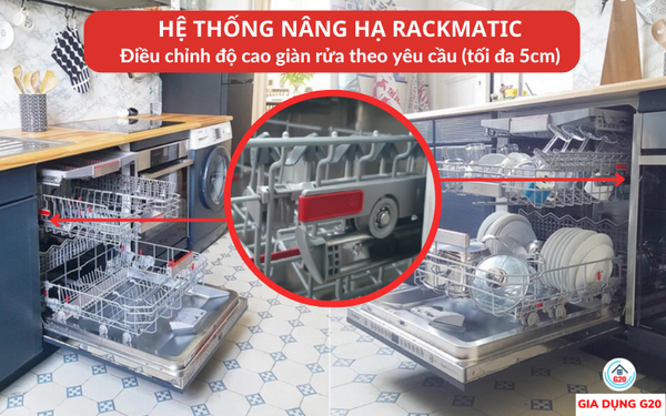Hệ thống nâng hạ RackMatic giúp kéo các khay rửa ra vào một cách dễ dàng. Bạn sẽ dễ dàng sắp xếp bát đĩa vào trong giỏ chứa. Ngoài ra, nhờ khớp nâng hạ Rackmatic khay rửa có thể nâng hạ lên xuống 5cm. Vì thế bạn sẽ xếp được nhiều vật dụng với các kích cỡ khác nhau.