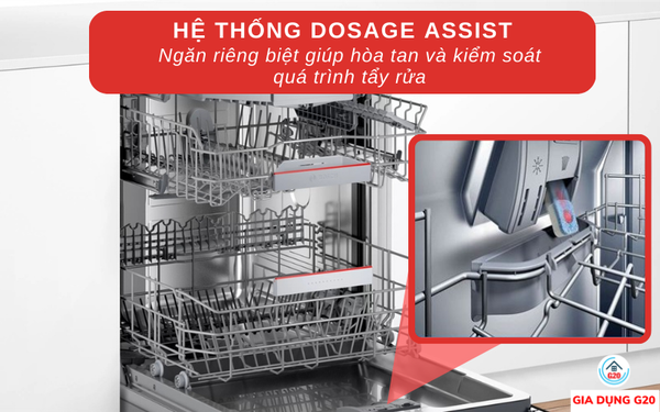 Dosage Assistant là một hệ thống tự động hòa tan và điều phối chất tẩy rửa.hiệu quả có thể nhìn rõ khi dùng chất tẩy rửa dạng viên nén. Khi vòi phun nước hoạt động sẽ làm bật nắp đựng chất tẩy rửa. Chất tẩy rửa sau đó được hòa tan với nước và được phân bổ đều khắp khoang máy. Các vòi phun sẽ phun rửa đồng đều lên bề mặt bát đĩa. Hơn nữa, hệ thống có thẻ cảm biến lượng bát đĩa để phân bổ sao cho phù hợp.