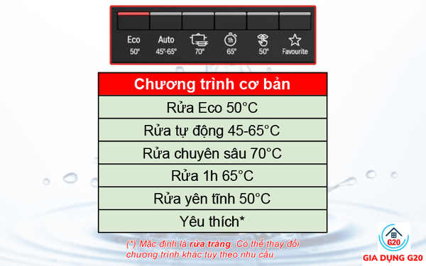 - Số chương trình rửa: 6 chương trình rửa bao gồm Rửa mạnh 70°C, Tự động 45-65°C, Tiết kiệm 50°C, Yên lặng 50°C, 1h 65ºC, Yêu thích (rửa tráng)
