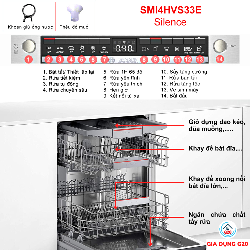 Thông số kỹ thuật chi tiết Máy rửa bát bán âm Bosch SMI4HVS33E – Serie 4, Dung tích 13 bộ
