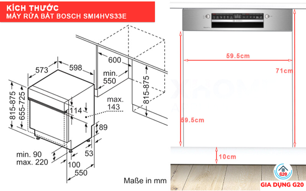 Kích thước của máy rửa chén bán âm SMI4HVS33E là 81.5 x 59.8 x 57.3 cm (CxRxS) với tổng trọng lượng cực nhẹ chỉ 35.3 kg. Với kích thước và trọng lượng này, thiết bị sẽ không tạo quá nhiều sức nặng cho tủ bếp, mà còn làm điểm nhấn nổi bật cho không gian bếp.