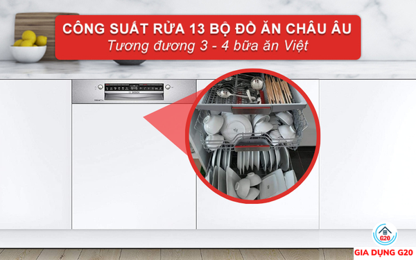Máy có dung tích chứa lớn với công suất rửa tối đa lên đến 13 bộ đồ ăn châu Âu. Số lượng bát đĩa này tương đương với lượng sử dụng trong 3 - 4 bữa ăn của người Việt. Nhờ đó, chỉ cần một lần rửa là máy đã có thể xử lý hết lượng bát đĩa bẩn của cả ngày. Công suất của máy rửa bát bán âm Bosch SMI4HVS33E serie 4 phù hợp để sử dụng trong gia đình 4 - 6 người.
