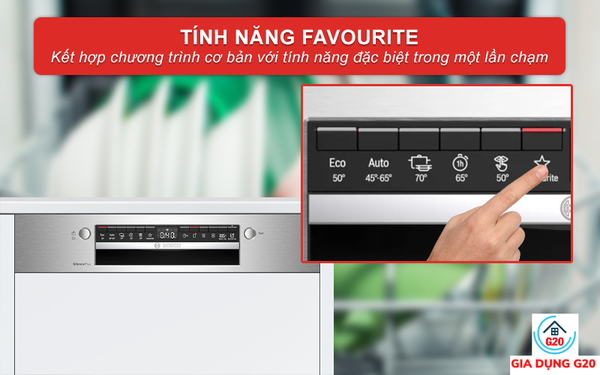 Mặc định của chương trình Favorite là tính năng rửa tráng Pre-Rinse. Ngoài ra, máy rửa bát bán âm Bosch SMI4HVS33E serie 4 còn cho phép tích hợp chương trình rửa riêng theo nhu cầu và sở thích thông qua tính năng tùy chọn Favorite này.