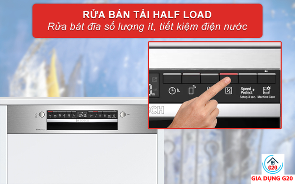 Lưu ý: khi chọn chế độ rửa bán tải Half Load, người dùng chỉ nên cho lượng chất tẩy rửa bằng một nửa so với khi rửa bát đũa đầy hết khoang. Để tiết kiệm mà bát đĩa cũng không bị nhờn.