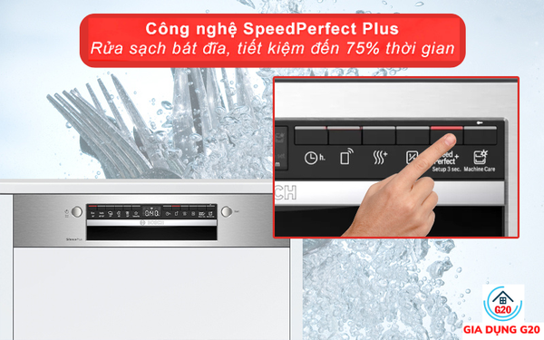 Với tính năng SpeedPerfect Plus, máy rửa chén sẽ tự động đẩy nhanh quá trình rửa full tải của chương trình cơ bản lên nhờ việc tăng nhiệt độ và áp lực nước. Nhờ đó, thời gian rửa sẽ được rút ngắn đến 75% so với thời gian thông thường.