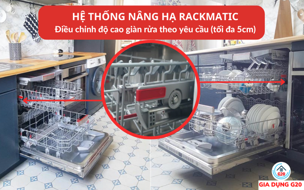 Đặc biệt, giàn giữa của máy được lắp đặt thêm hệ thống nâng hạ Rackmatic cho phép tùy ý điều chỉnh độ cao của giàn lên đến 5cm và thay đổi chiều cao giữa các giàn. Nhờ hệ thống này, giàn dưới cùng có khoảng trống đủ để đặt để các loại xoong, nồi, chảo có kích thước lớn.