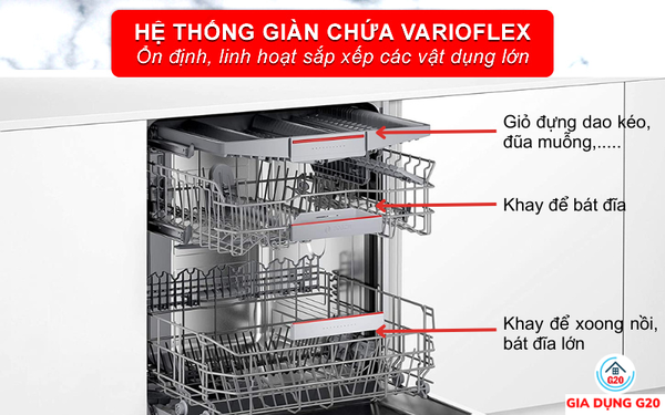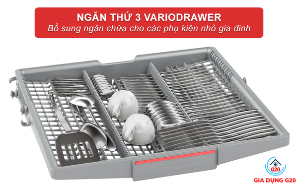 Hệ thống giàn rửa của máy rửa bát bán âm Bosch SMI4HVS33E được bổ sung ngăn chứa thứ 3 VarioDrawer dành riêng để các vật dụng kích thước nhỏ như dao, dĩa, thìa, chén, tách. Thiết kế giỏ dạng lưới có bề mặt hình răng cưa cho phép sắp xếp các vật dụng này một cách chắc chắn, không bị rơi xuống giàn rửa dưới trong quá trình máy hoạt động.