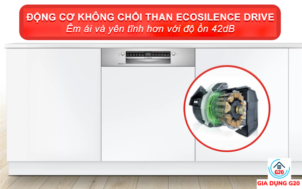 Máy rửa bát bán âm Bosch SMI4HVS33E được lắp đặt động cơ không chổi than EcoSilence Drive. Với bộ động cơ này, độ ồn tối đa khi hoạt động của máy chỉ ở mức 42 dB tương đương với tiếng nói chuyện thì thầm, không gây ảnh hưởng đến thính giác.