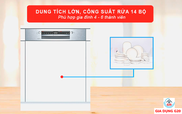Máy rửa bát Bosch SMI6TCS00E serie 6 có công suất rửa 14 bộ đồ ăn. Đây là lượng bát đĩa trong bữa ăn của người Âu, còn với người Việt nó tương đương 3-4 bữa ăn. Vì có thể rửa được nhiều bát đĩa một lúc như vậy nên nó phù hợp với gia đình có 4-6 người.