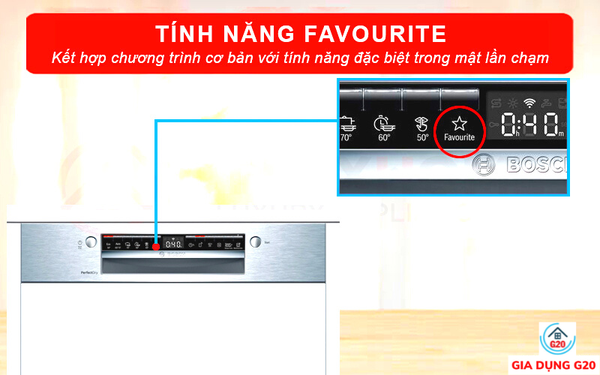 Chương trình Favourite (yêu thích) là một chương trình cơ bản. Với chương trình này, bạn có thể tích hợp một chương trình rửa mà bạn thích với một tính năng đặc biệt khác. Điều này giúp bạn có một sự kết hợp như ý muốn. Sự kết hợp này sẽ được lưu thẳng vào bộ nhớ và những lần rửa sau bạn chỉ cần nhấn nút Favourite. Ngoài tính năng phối kết hợp đó ra, Favourite còn thực hiện chức năng rửa tráng.