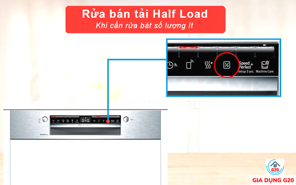 Kích hoạt rửa bán tải Half Load khi cần rửa bát đĩa số lượng ít