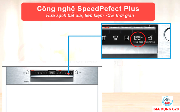 “SpeedPerfect Plus” sẽ mang đến một tính năng tuyệt vời trong quá trình sử dụng máy rửa bát Bosch SMI6TCS00E. Với tính năng này, mọi chương trình rửa thường sẽ trở nên ưu việt hơn. Đó là nhờ khả năng rửa tăng tốc của SpeedPerfect Plus. Các chương trình rửa sẽ tự động giảm đến 75% thời gian rửa thường. Nếu bạn không có nhiều thời gian chờ đợi, hãy dùng tính năng này như một giải pháp hỗ trợ nhé.