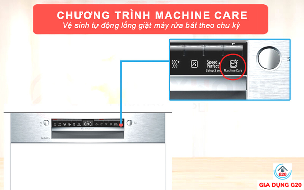 Và máy rửa bát Bosch SMI6TCS00E serie 6 đã được trang bị tính năng vệ sinh máy tự động. Được ký hiệu trên bảng điều khiển là dòng chữ “Machine Care”. Nhờ tính năng này mà máy sẽ tự động dọn dẹp và thanh tẩy các khay rửa. Trả lại cho bạn một chiếc máy như vừa mới mua, sạch sẽ và không có mùi thức ăn. Chỉ cần nhấn nút bạn sẽ không mất thời gian vệ sinh mà máy vẫn sẽ được chăm sóc đúng cách.