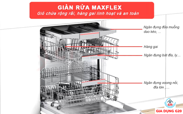 Hệ thống giỏ chứa MaxFlex được thiết kế với 3 giàn rửa, mỗi giàn là một không gian chứa an toàn và chắc chắn. Ngoài ra nó còn có tính chuyên biệt vì mỗi ngăn sẽ dùng để chứa những vật dụng khác nhau. Hai giàn rửa dưới bằng kim loại, mỗi giàn đều có hàng gai để cố định đồ cần rửa. Thêm nữa với các giá đỡ kính ở giàn dưới, có thể đảm bảo an toàn cho các đồ dùng thủy tinh.