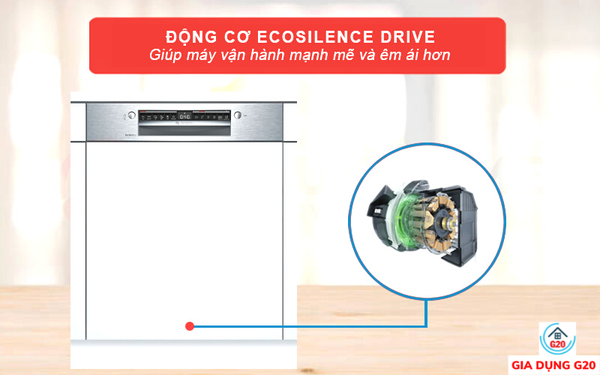 Máy rửa bát Bosch serie 6 SMI6TCS00E là một dòng máy cao cấp được thiết kế với động cơ EcoSilence Drive. Đây là một động cơ sử dụng quạt làm mát và tăng lưu thông không khí trong máy. Ngoài ra với thiết kế không dây roăng liên kết và không chổi than, máy sẽ hoạt động trơn tru và không tạo ra tiếng ồn. Như các thông số trên máy, máy chỉ có độ ồn ở mức 44dB và thấp hơn khi kích hoạt chương trình rửa yên tĩnh. Hiệu quả mà nó đem lại không chỉ là tạo cảm giác thoải mái cho người dùng. Mà còn tiết kiệm tối đa năng lượng trong các chu trình rửa.
