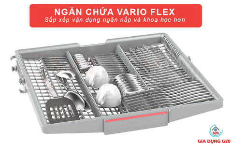 Ngoài ra với thiết kế ngăn chứa thứ 3 VarioFlex, những đồ dùng nhỏ sẽ được sắp xếp khoa học hơn. Đây là ngăn chứa linh hoạt bởi nó chuyên để những đồ dùng nhỏ như thìa, dao, dĩa… Với thiết kế chắc chắn và được lắp đặt phía trên cùng, những đồ cần rửa vẫn sẽ được rửa sạch hoàn toàn.