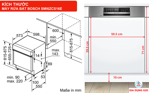 Máy rửa bát Bosch SMI6ZCS16E có kích thước 815x598x573 mm (CxRxS) và trọng lượng 47,1 kg.