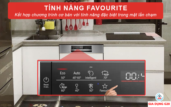 Ngoài ra, Favourite còn cho phép người dùng kết hợp các chương trình rửa cơ bản khác với tính năng đặc biệt giúp người dùng thao tác chỉ với 1 nút nhấn duy nhất. Tiện lợi hơn là người dùng có thể sử dụng tính năng này thông qua ứng dụng Home Connect trên thiết bị di động.