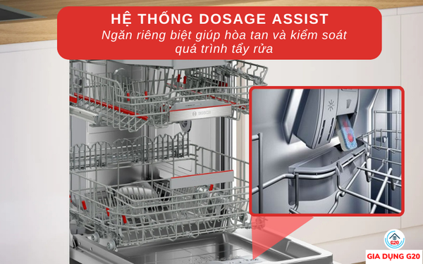 Hệ thống Dosage Assistant có khả năng phân tích được lượng chất tẩy rửa cần thiết với lượng bát đĩa mức độ bẩn thông qua cảm biến đo lường bên trong khoang rửa. Chất tẩy rửa sẽ được hòa tan đồng đều với nước. Sau đó, phân bổ đều chất tẩy rửa đến các giàn chứa. Tránh tình trạng chất tẩy rửa bị vón cặn, không hòa tan hết hoặc bám trên vật dụng, bát đĩa.