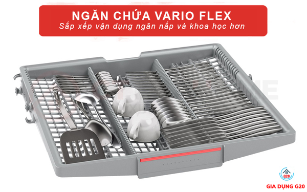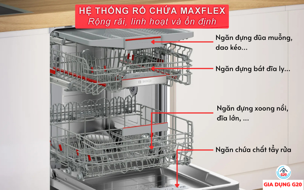 Hệ thống giỏ chứa MaxFlex gồm 3 giàn rửa rộng rãi có thể chứa nhiều bát đĩa hay các vật dụng to nhỏ khác nhau, thêm vào đó là giàn thứ 3 Vario Schublade đựng các vật dụng như muỗng, đũa, tách trà, tách cafe,...