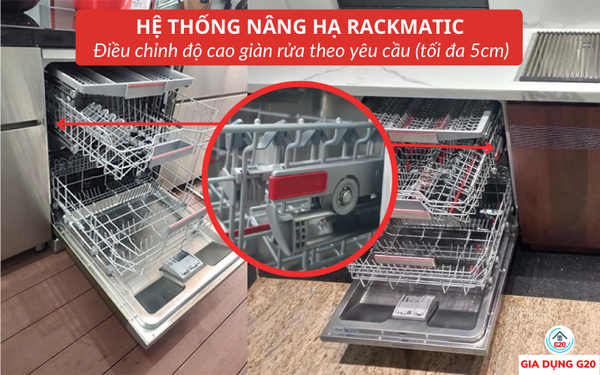 Hệ thống điều chỉnh RackMatic giúp bạn có thể tùy chỉnh không gian trong máy kéo ra vào dễ dàng, còn có khả năng nâng hạ xuống tới 5cm cho phép bạn đặt giỏ trên ở 3 vị trí khác nhau và vị trí đã chọn có thể dễ dàng thay đổi ngay cả khi giàn rửa đã chứa đầy bát. Điều này giúp làm tăng không gian sử dụng cho giỏ chứa dưới.