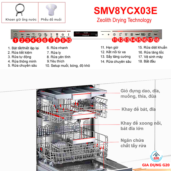 Máy rửa bát SMV8YCX03E được áp dụng công nghệ tiên tiến sấy Zeolith giúp cho bát đũa sạch khô hoàn hảo.