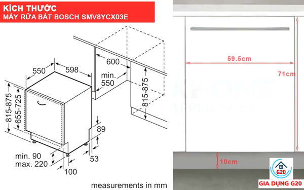 Máy rửa bát SMV8YCX03E có kích thước 815 x 598 x 550mm và trọng lượng 44,7kg