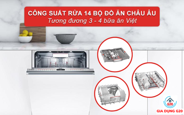 Máy rửa bát âm tủ SMV8YCX03E được thiết kế lòng máy dung tích lớn, có thể rửa công suất lên đến 14 bộ đồ ăn Châu Âu tương đương với 3 - 4 bữa ăn của gia đình 4 - 6 người Việt.