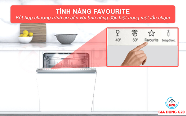 Chương trình yêu thích Favourite cho phép người dùng có thể kết hợp 1 chức năng cơ bản và tính năng đặc biệt trong một nút ấn. Khi ở chế độ mặc định thì chương trình yêu thích được mặc định là chương trình rửa tráng 15 phút.
