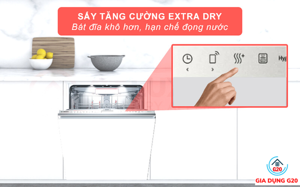 Khi người dùng muốn có bát đũa khô cong để dùng ngay hoặc không hài lòng về độ khô của chương trình rửa đã chọn trước đấy thì có thể chọn thêm chức năng sấy tăng cường Extra Dry.