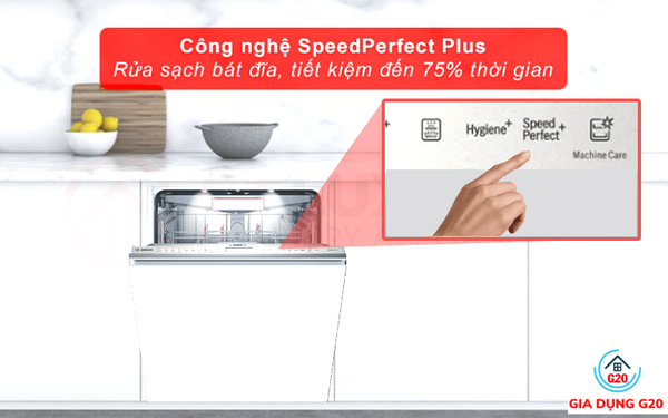 Chế độ rửa diệt khuẩn Hygiene Plus của máy rửa bát Bosch SMV8YCX03E rửa đồ dùng ở nhiệt độ cao từ đó tiêu diệt đến 99,9% vi khuẩn có trên bát đũa, bảo vệ sức khỏe gia đình.