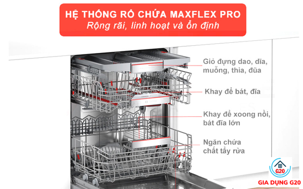 - Rổ Max Flex Pro: Dễ dàng xếp và bảo vệ bát đĩa của bạn.