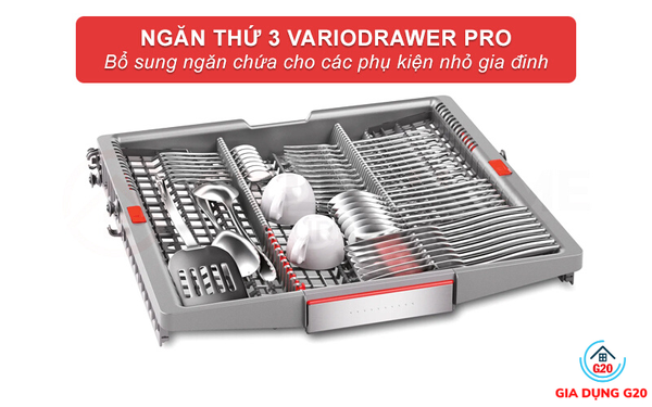 Máy rửa chén Bosch SMV8YCX03E serie 8 có giàn thứ 3 VarioDrawer Pro để các vật dụng nhỏ tạo không gian rộng hơn cho 2 giàn còn lại.