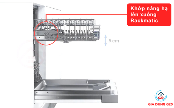 Hệ thống nâng hạ Rackmatic giúp thay đổi chiều cao lên xuống 5cm của giàn giữa, người dùng có thể linh hoạt để các vật dụng có kích thước khác nhau