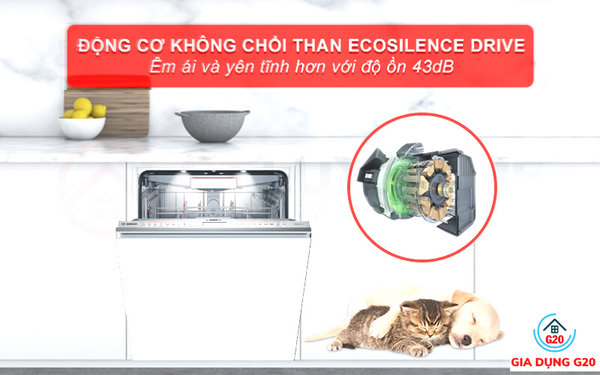 Máy rửa chén bát SMV8YCX03E được Bosch trang bị động cơ EcoSilence Drive để máy có thể hoạt động với công suất mạnh mẽ nhưng động cơ hoạt động vẫn rất êm ái (độ ồn 43 dB - chỉ bằng tiếng nói chuyện thì thầm)