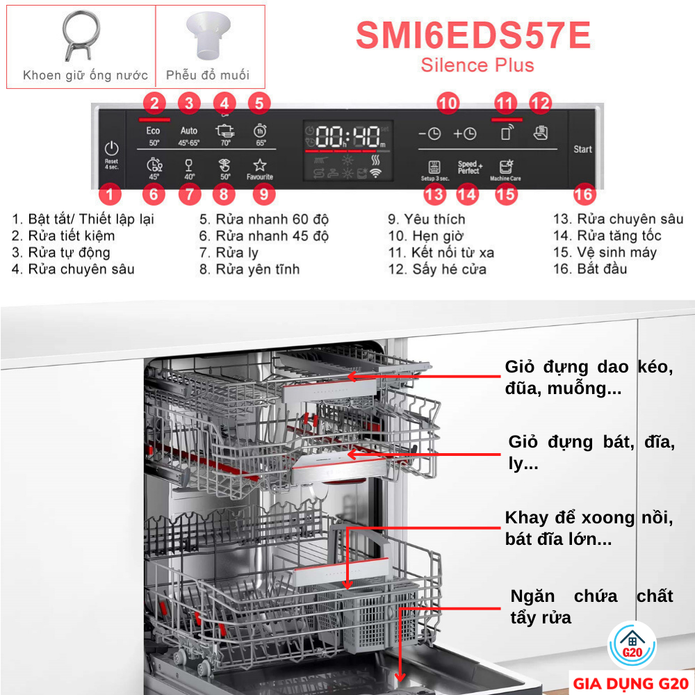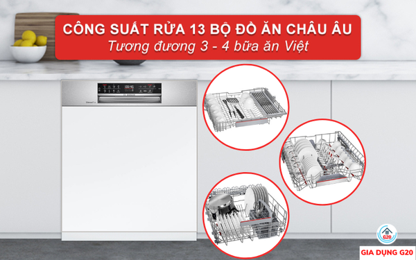Thông số kỹ thuật chi tiết Máy rửa bát Bosch bán âm SMI6EDS57E - SERIE 6, Dung tích 13 bộ