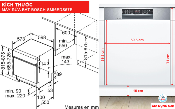 Máy rửa bát Bosch SMI6EDS57E có kích thước là 81.5 x 59.8 x 57.3 cm (CxRxS) với tổng trọng lượng máy là 44,2 kg.