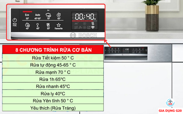 Máy rửa bát Bosch SMI6EDS57E serie 6 đáp ứng được mọi nhu cầu sử dụng của gia đình bạn với 8 chương trình rửa chính là: Rửa mạnh 70°C, Rửa tự động 45-65°C, Rửa tiết kiệm 50°C, Rửa yên lặng 50°C, Rửa 1h 65°C, Rửa nhanh 45°C, Rửa ly 40°C, Yêu thích.