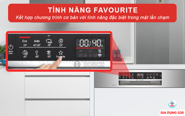 Mặc định, chương trình Favourite sẽ là tính năng rửa tráng bát đĩa (PreWash). Khi tùy chọn Favourite, người dùng có thể kết hợp một chương trình cơ bản với một tính năng đặc biệt mà bạn yêu thích. Chẳng hạn như bạn kết hợp rửa Eco 50 độ với sấy hé cửa hiệu quả EfficientDry. Sau đó, bạn có thể lưu lại chương trình kết hợp này bằng cách nhấn giữ nút Favourite trong vòng 3 giây.