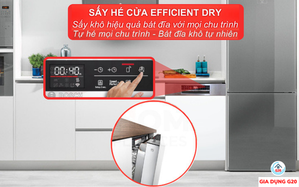 Với tính năng EfficientDry, máy rửa bát Bosch bán âm Bosch SMI6EDS57E sẽ tự động hé cửa khi chương trình rửa kết thúc. Lúc này, hơi ẩm được thổi ra bên ngoài giúp bát đĩa khô cong tự nhiên và không bị ám mùi.