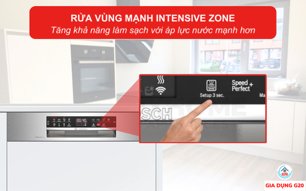 Chức năng rửa chuyên sâu Intensive Zone sẽ sử dụng nhiệt độ nước cao hơn, cung cấp áp lực nước mạnh hơn so với các chương trình rửa thông thường. Điều này giúp nồi chảo hoặc các loại bát đĩa siêu bẩn ở giàn dưới cùng được làm sạch trong điều kiện tối ưu hơn.