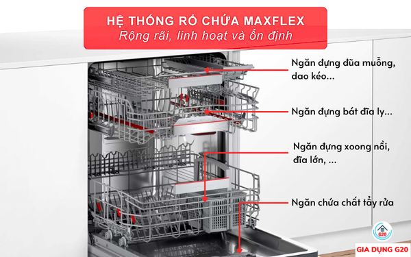 Hệ thống giỏ chứa MaxFlex thường có trong những máy có dung tích lớn. Và máy rửa bát Bosch SMI6EDS57E có thể rửa đến 13 bộ bát đĩa châu Âu nhờ hệ thống này. Các giỏ chứa được thiết kế rộng rãi để tăng dung tích chứa đồ. Ngoài ra mỗi giỏ đều có hàng gai có thể gập mở để sử dụng cho những mục đích để đồ khác nhau. Và giỏ dưới có thêm lót silicon để tránh nứt vỡ các đồ dùng bằng sứ, thủy tinh.