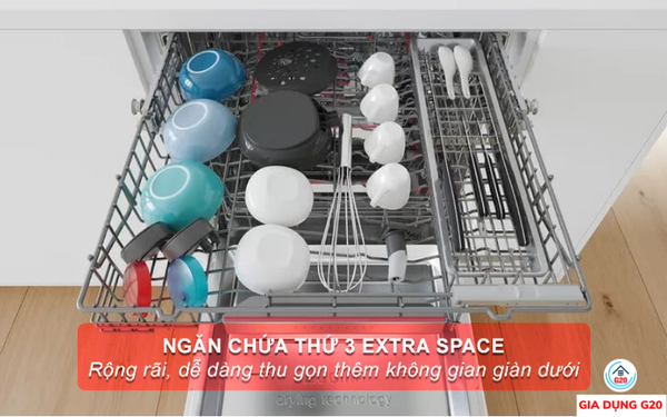 Ngăn chứa thứ 3 Extra Space được trang bị trên máy rửa chén Bosch SMI6EDS57E giúp người dùng sắp xếp các vật dụng nhỏ ngăn nắp và khoa học hơn.