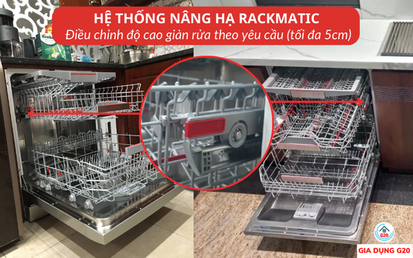 Với hệ thống Rackmatic, người dùng có thể dễ dàng điều chỉnh độ cao của giàn rửa theo nhu cầu thông qua các khớp nối trên giàn. Người dùng cũng có thể điều chỉnh độ cao giỏ chứa ngay cả khi đang đầy. Với hệ thống này, không gian mỗi giàn rửa được kéo cao hơn để tạo khoảng trống chứa vật dụng lớn.