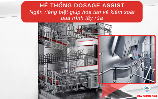 Hệ thống hỗ trợ phân phối chất tẩy rửa Dosage Assistant được tích hợp để tối đa hiệu quả rửa của máy khi sử dụng chất tẩy rửa dạng viên. Sau khi cho viên rửa bát vào ngăn chứa và chạy máy, viên rửa sẽ rơi xuống khoang đặc biệt ở giàn rửa thứ 2.