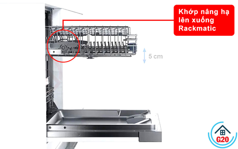 Ngay cả với một giỏ phía trên được xếp đầy đủ, chiều cao có thể được điều chỉnh trong 3 cm lên đến 5 cm. Nhờ hệ thống giá đỡ 3 chiều, giỏ phía trên có thể được điều chỉnh độ cao tổng cộng 5cm bằng một tay cầm. Và thậm chí được xếp đầy đủ. Dù là đĩa đựng bánh pizza hay ly có thân dài – nhiều không gian hơn được tạo ra một cách linh hoạt bên trên hoặc bên dưới cho các đồ cao cần rửa.